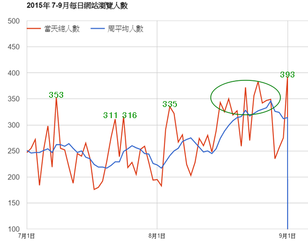 下面的圖片是本網站每日到訪「當天總人數」與「週平均人數(當天及前6天共7天之平均人數)」曲線圖。最近二週(8/15~28,共14日)畫圈部分為連續超過300人部分,300~350人有5天,350人以上有5天(不含週六、日)。甚至8月16日343人、8月22日372人的週六、日人數都是表明有一些人願意犧牲假日來充實運轉EER技術。其餘超過300人者均有標明數字。這些增加的人數顯示出大家對運轉EER的重視及普及程度。